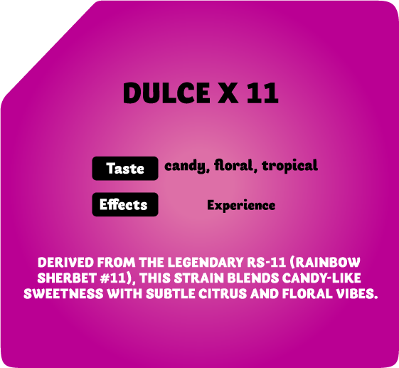 Derived from the legendary RS-11 (Rainbow Sherbet #11), this strain Blends candy-like sweetness with subtle citrus and floral vibes.